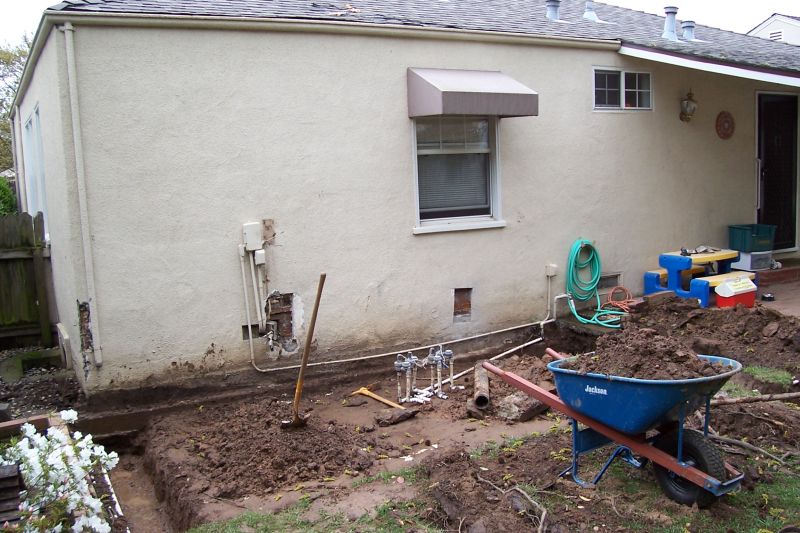 Construction finally began on March 14, 2005. The first week as a lot of digging and destroying. First thing, the air-conditioner had to be disconnected and moved out of the way. It was now a race to see which would happen first; a 100° day or the completion of enough of the work to hook the unit back up The existing brick planter was destroyed and digging begun. A huge pile of dirt and debris began to grow on our driveway (the dumpster was still to come). The girls and the dog loved to play "king of the hill" on it. But I hated all of the mud they brought in. Our poor contractor had to contend with massive roots, moist clay soil, and 60+ years of history. He found an old sewer line, and old gas line, and an old water line in the excavation. That is along with the existing sewer and water lines that he had to uncover so they could be moved out of the way. He also had to remove the valves for the automatic sprinkler system. We figured that the backyard grass was doomed but I had extra hoses, sprinklers, and timers ready to try and keep the planters and front-yard alive. Again, it was a race against time. |