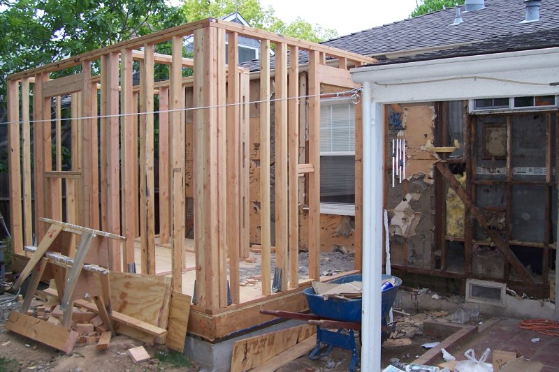 We had to abandon the idea of adding a small window to the new shower when it became known that new plans would have to be drawn up and submitted to the city for approval. Wednesday, the exterior walls were nearly complete. But we hit two snags. First the window opening was smaller than we had planned. We called and asked that a larger one be put in. Then we noticed just how small the sitting area was going to be. We panicked! Ben measured it and proclaimed it to be 57-inches wide. We rushed out to make sure we could find a desk that would fit. After all the excitement, by Friday... even the interior walls were framed and it was really starting to look good. |